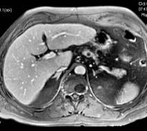 Recherche de métastases dans le bilan d'un adénocarcinome du colon. Pas de métastases visibles mais aspect de cirrhose hépatique, diagnostic confirmé ultérieurement par l'histologie